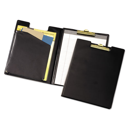 Letter-size clip padfolio features brass finish clip at top center to securely hold contents. Notched cover stays flat when closed. Inside front cover includes patented Expand-A-Pocket that holds a generous, 1/2" thick stack of papers. Sturdy, sealed vinyl pad holder also includes a ruled writing pad.