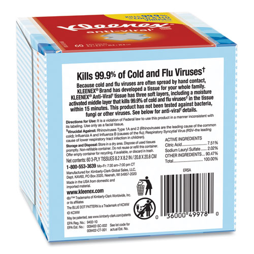 Kleenex Anti-Viral Tissues can kill 99.9 percent of cold and flu viruses, helping you to take care of you, your family and your office or business during cold and flu season. They are made with three soft plies, including a moisture-activated middle layer that kills cold and flu viruses in the tissue. Tissues are virucidal against Rhinoviruses Type 1A and 2 (Rhinoviruses are the leading cause of the common cold); Influenza A and Influenza B (causes of the flu); Respiratory Syncytial Virus (RSV - the leading cause of lower respiratory tract infection in children). |