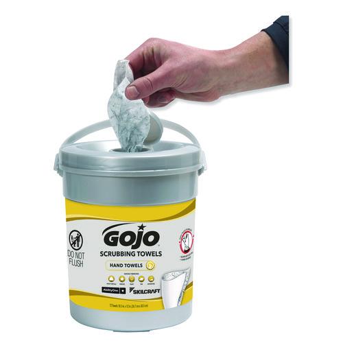 GOJO® SKILCRAFT® Scrubbing Towels are heavy-duty and designed to tackle tough cleaning jobs including heavy soils, tar, grease, and adhesives. Dual-textured, pre-moistened towels work to scrub away dirt and soils.