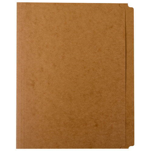 Heavy-duty, 25 pt. SKILCRAFT Kraft paperboard folder features a plain-folded bottom that expands up to 0.75", for extra storage capacity. Secure-bonded, two-prong fastener on the inside back cover accommodates most standard two-hole, top-punched sheets.